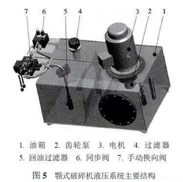 新款顎式破碎機通常使用液壓系統來輔助調整破碎機排料口大小,方便快捷,其液壓系統主要結構如圖5所示。