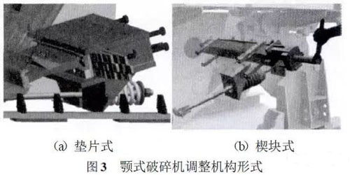 顎式破碎機調整機構如圖3所示,目前調整機構形式主要分為墊片式和楔塊式兩種結構。