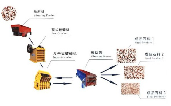 大塊石料經(jīng)料倉由振動給料機(jī)均勻的送進(jìn)顎式破碎機(jī)進(jìn)行粗碎,粗碎后的石料由輸送機(jī)送到反擊式破碎機(jī)進(jìn)行進(jìn)一步破碎,細(xì)碎后的石料由輸送機(jī)送到振動篩進(jìn)行篩分,篩分出幾種不同規(guī)格的石子,滿足顆粒要求的石子,由成品輸送機(jī)送往成品料堆,不滿足顆粒要求的石子,由輸送機(jī)返料送到反擊式破碎機(jī)進(jìn)行再次破碎,形成閉路多次循環(huán),成品粒度可按照用戶的需求,進(jìn)行組合和分級,為保護(hù)環(huán)境,可配置輔助的除塵設(shè)備。