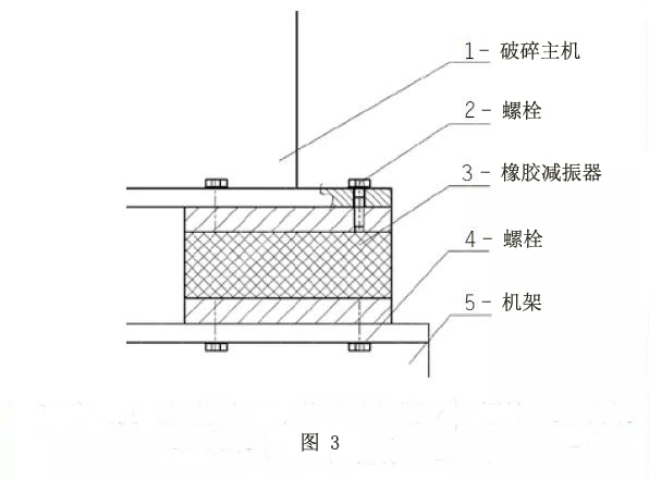 剛性連接時,由于破碎主機與機架之間沒有緩沖、減振裝置,破碎機產(chǎn)生的振動直接傳遞到機架上,幾乎沒有緩沖和振動抑制,因此機架與破碎機結(jié)合處以及與機架連接的其他部件均受到不同程度的振動損傷,使用壽命受到不同程度的影響。因此本方案不適合沖擊較大的破碎機,如顎式破碎機和圓錐式破碎機。但其結(jié)構(gòu)形式簡單、成本低等優(yōu)點特別明顯,在沖擊不大的反擊式破碎機應(yīng)用較多,但此時要注意機架結(jié)構(gòu)局部加強,防止機架疲勞斷裂。