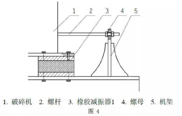 由于橡膠與鋼板膠合力較小,因此這種減振器只允許承受軸向壓力和較小的徑向剪切力。破碎機工作時會產(chǎn)生較大的沖擊和振動,因此破碎機一般選用皮帶傳動,用于緩沖和吸能。為了保證傳動皮帶具有足夠的預(yù)緊力、防止皮帶脫軌飛出,并避免減振器因徑向過載損壞,需要限制減振器徑向位移,所以需要在破碎機傳動皮帶預(yù)緊力方向上增加機械鎖止機構(gòu)(如圖4所示),用螺桿限制破碎機在此方向上的位移量。