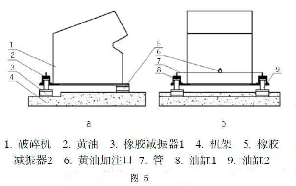 如圖5所示,油缸8、油缸9的缸筒與破碎機連接,油缸活塞桿與減振器3上側(cè)鋼板連接,減振器3和減振器5下側(cè)鋼板與機架4連接,減振器5上側(cè)鋼板與破碎機1連接,油缸8和油缸9的無桿腔通過油管7聯(lián)通,兩油缸無桿腔內(nèi)通過黃油加注口6加注黃油,因為兩腔聯(lián)通,因此兩無桿腔壓力始終相等。
