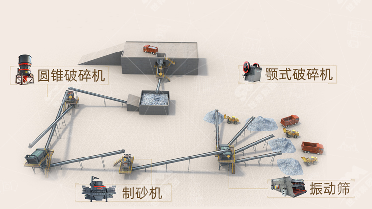 砂石加工成套設備其實就是一條砂石生產線,砂石生產線主要由破碎機、制砂機以及一些輔助設備組成,大致由顎式破碎機或反擊式破碎機或圓錐破碎機、制砂機、給料機、輸送帶、振動