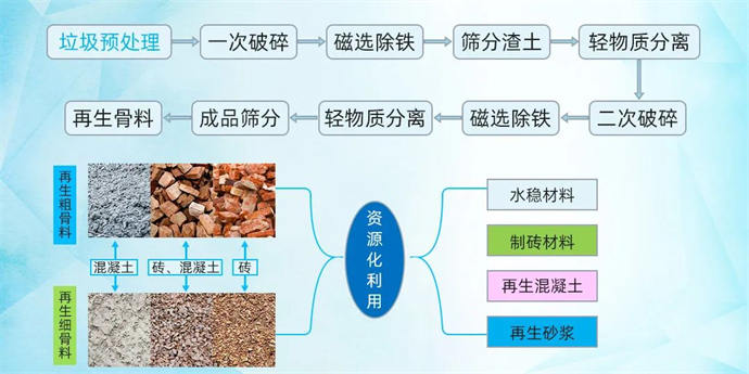 2 環(huán)保智能生產(chǎn)工藝,通過分揀、破碎、篩分、磁選、分離、整形等工藝,產(chǎn)出成品料可用作再生骨料、拌和混凝土及制成再生磚,實(shí)現(xiàn)變廢為寶