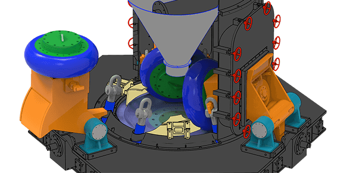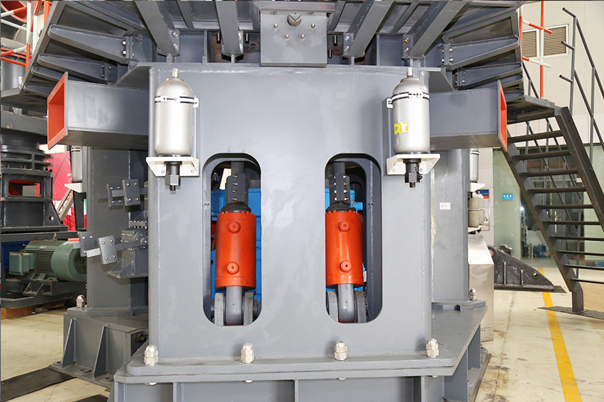 該機設計過程中我們充分考慮重型磨輥可能帶來的養(yǎng)護難題,最終開發(fā)設計了可翻轉結構。該結構配合液壓調整系統(tǒng),操作員可輕松、快捷的將磨輥翻出機殼外部進行檢修,更換輥套、襯板等養(yǎng)護操作,減少停機損失。