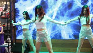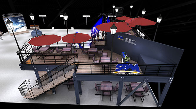 展臺共兩層,樓上為商務(wù)洽談區(qū)與模特靜態(tài)展示區(qū),一層為產(chǎn)品展示區(qū)、活動演藝區(qū)等