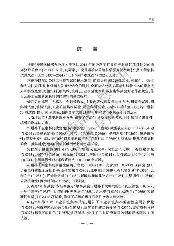 本規程以推動公路工程集料試驗技術發展,提高集料試驗的規范性、可性、一致性和先進性為目標,按繼承與發展相結合的原則,全面總結公路工程集料試驗技術的研究成果和實踐經驗,對粗集料、細集料、填料、工業礦渣集料和再生集料試驗方法作出規定,作為公路工程集料試驗時共同遵守的基礎標準。