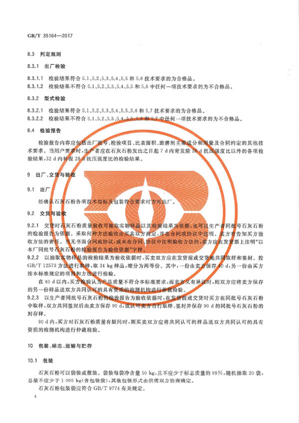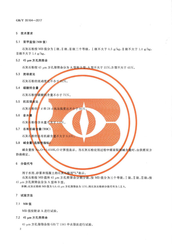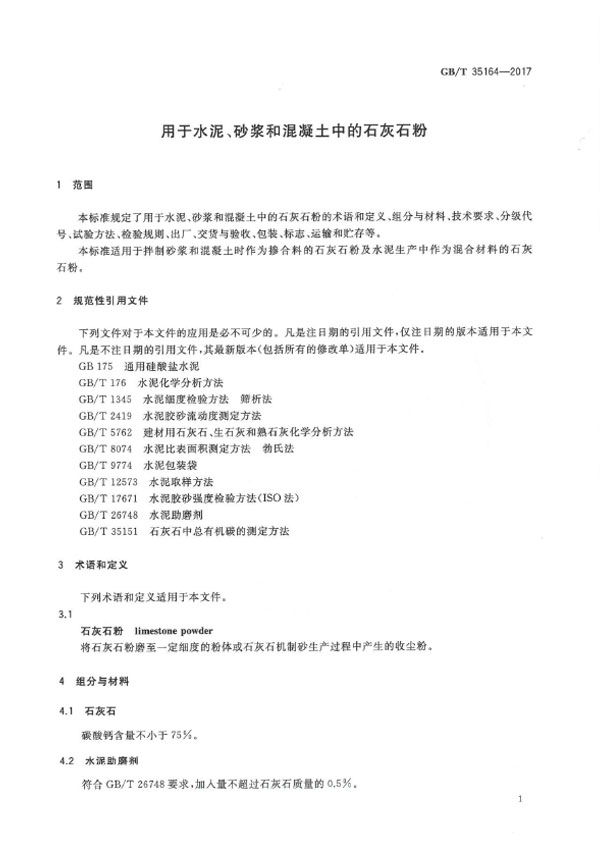 本標準規定了用于水泥、砂漿和混凝土中的石灰石粉的術語和定義、組分與材料、技術要求、分級代號、試驗方法、檢驗規則、出廠、交貨與驗收、包裝、標志、運輸和貯存等。