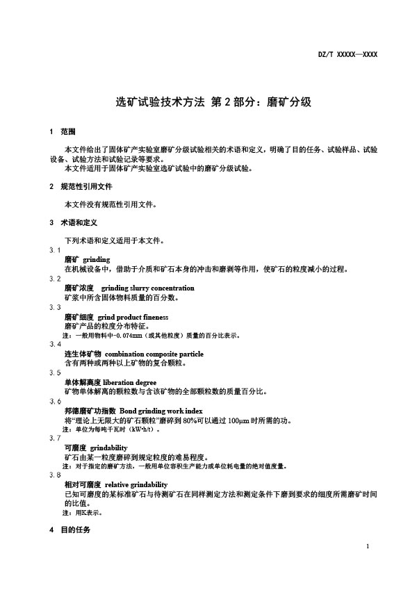 本文件給出了固體礦產(chǎn)實(shí)驗(yàn)室磨礦分級(jí)試驗(yàn)相關(guān)的術(shù)語和定義,明確了目的任務(wù)、試驗(yàn)樣品、試驗(yàn)設(shè)備、試驗(yàn)方法和試驗(yàn)記錄等要求。本文件適用于固體礦產(chǎn)實(shí)驗(yàn)室選礦試驗(yàn)中的磨礦分級(jí)試驗(yàn)。