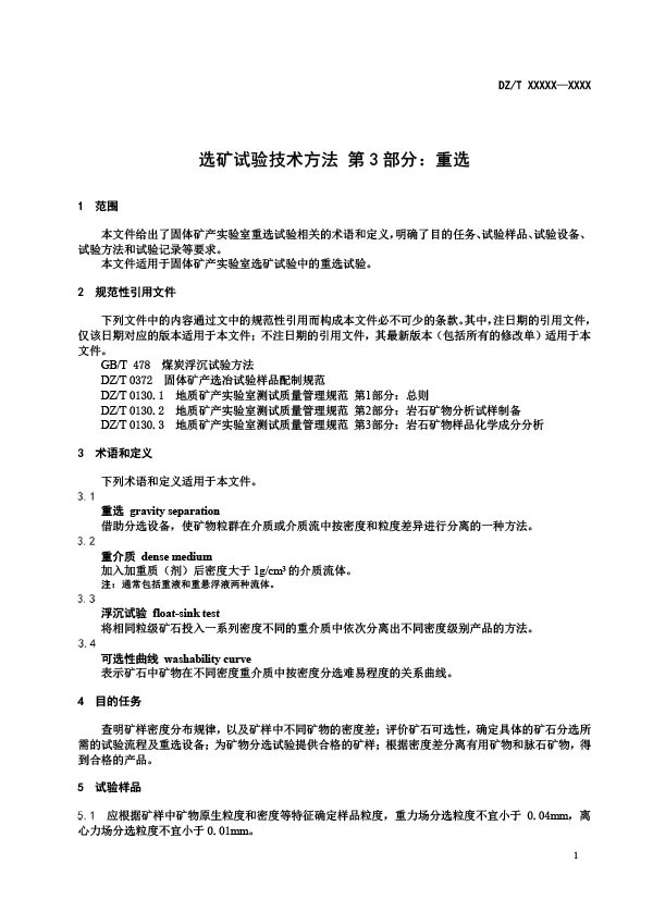 本文件給出了固體礦產實驗室重選試驗相關的術語和定義,明確了目的任務、試驗樣品、試驗設備,試驗方法和試驗記錄等要求。本文件適用于固體礦產實驗室選礦試驗中的重選試驗。