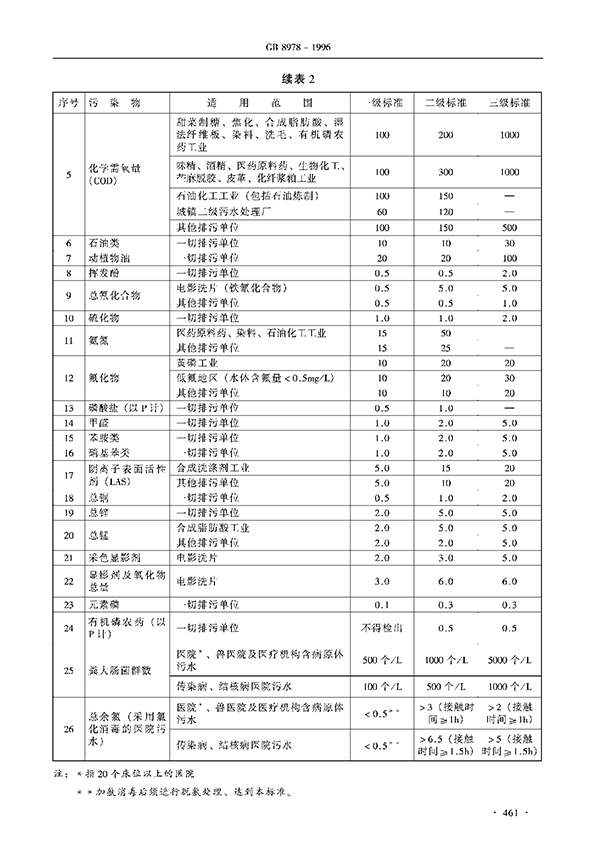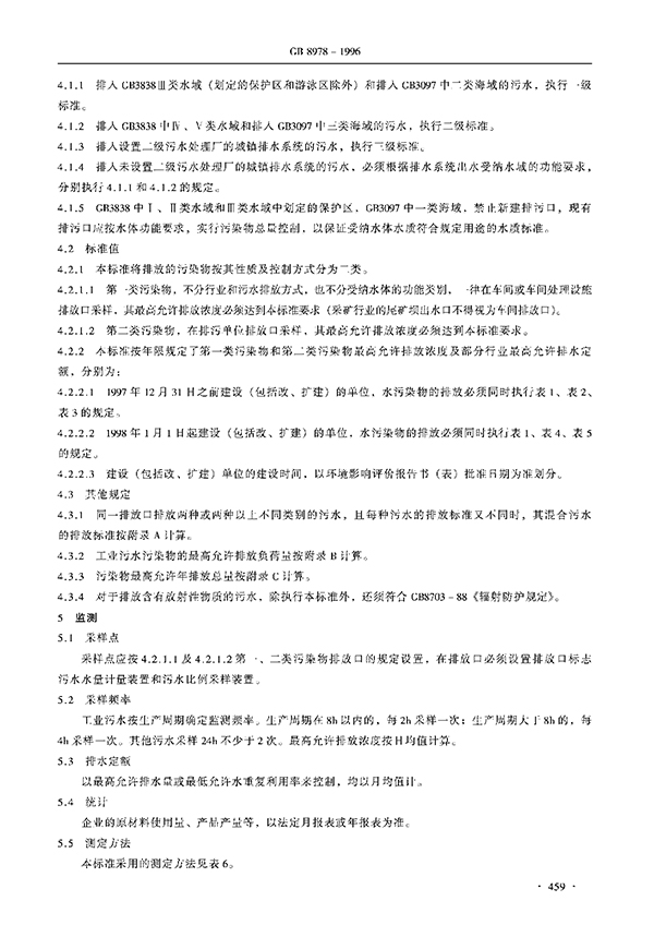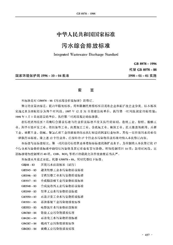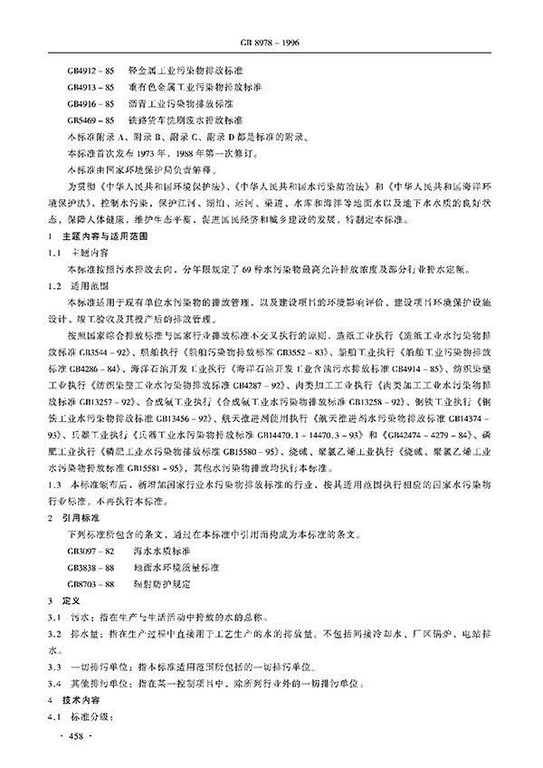 本標準按照污水排放去向,分年限規定了69種水污染物理想允許排放濃度及部分行業理想允許排水量。本標準適用于現有單位水污染物的排放管理,以及建設項目的環境影響評價、建設項目環境保護設施設計、竣工驗收及其投產后的排放管理。